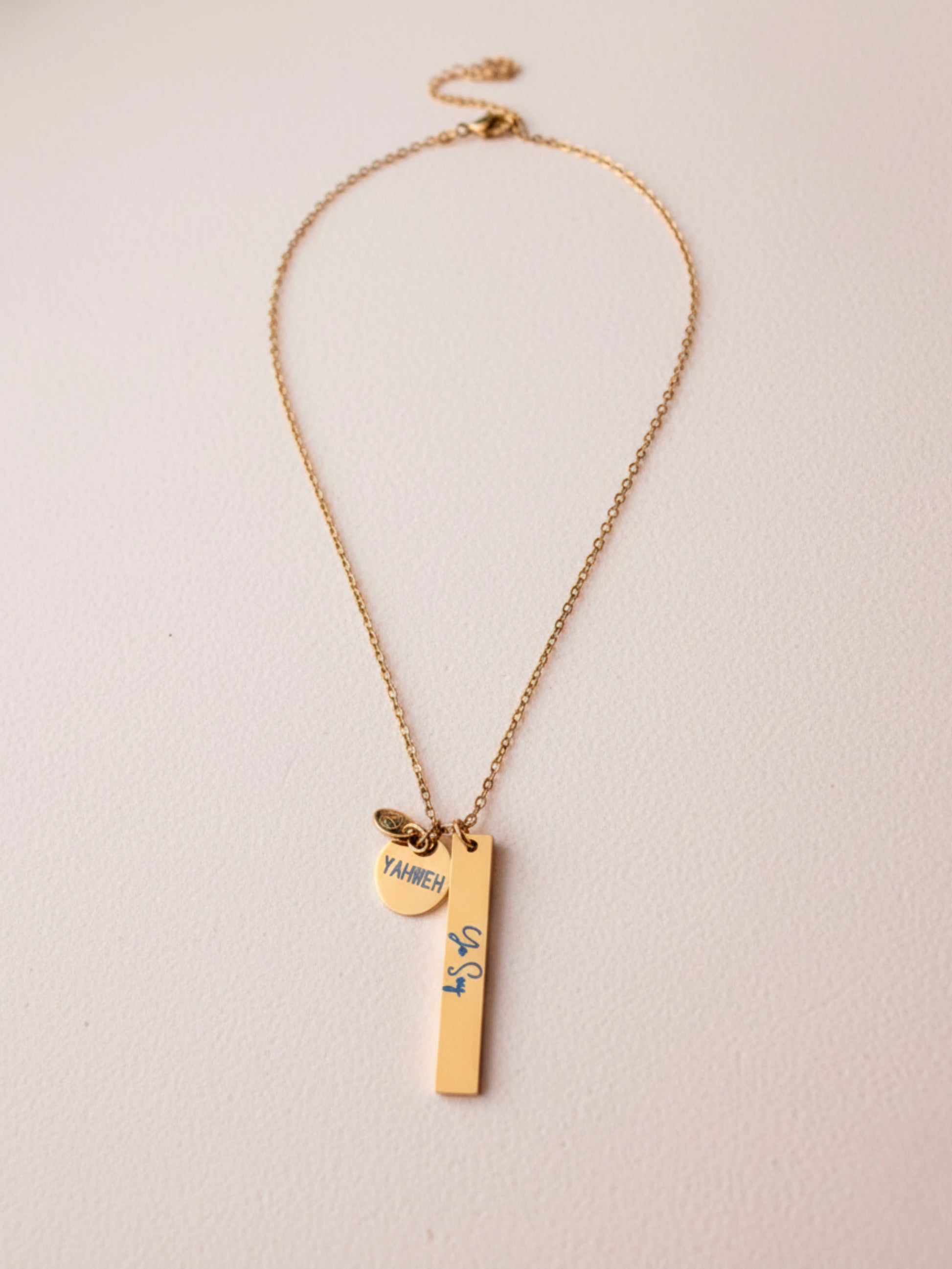 Este collar está fabricado en acero inoxidable con un acabado dorado resistente, e incluye colgantes que llevan el nombre «Yahwe» junto con los significados asociados. Combina durabilidad y simbolismo espiritual, ideal para quienes valoran una joya que refleja fe con elegancia y solidez.